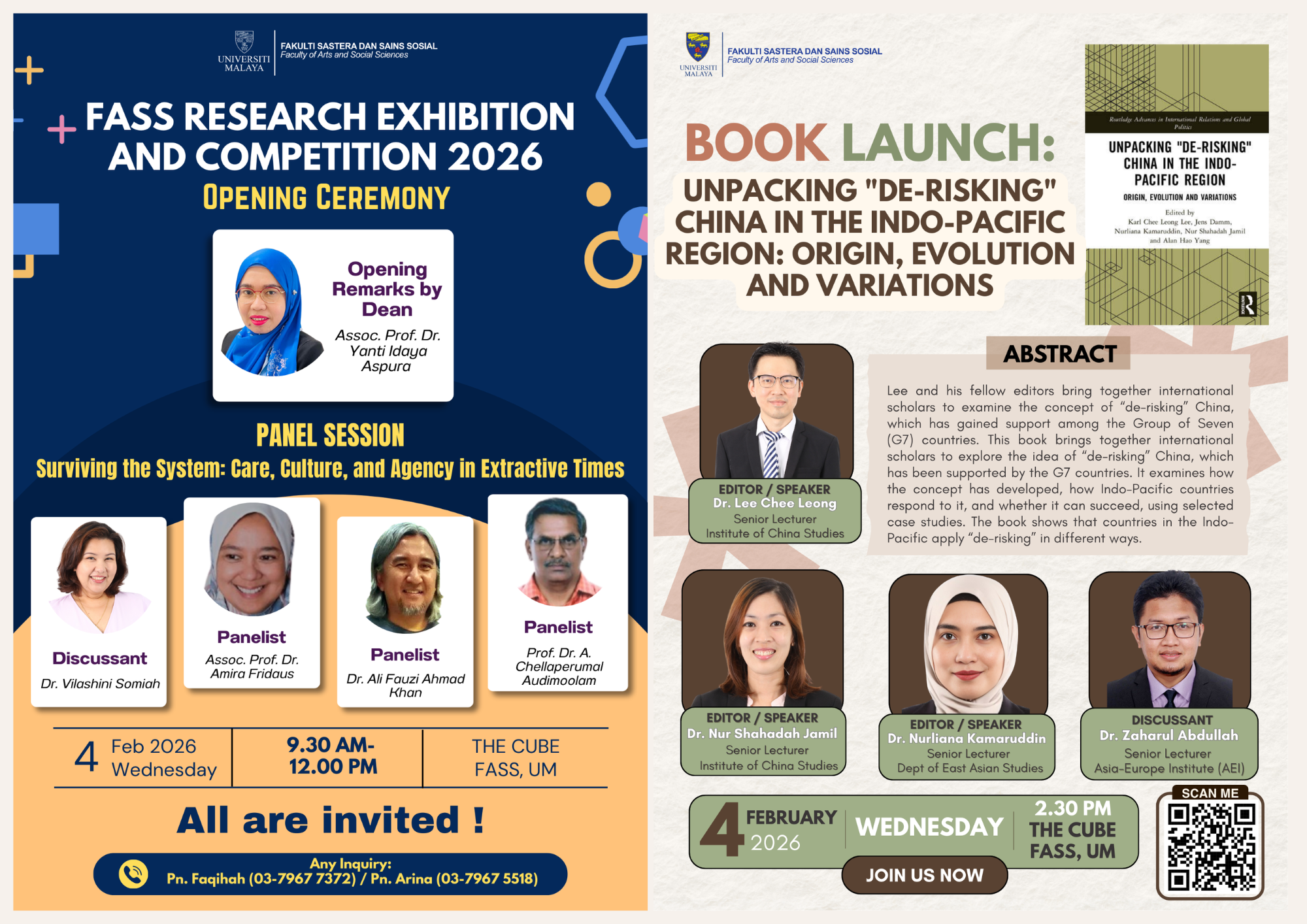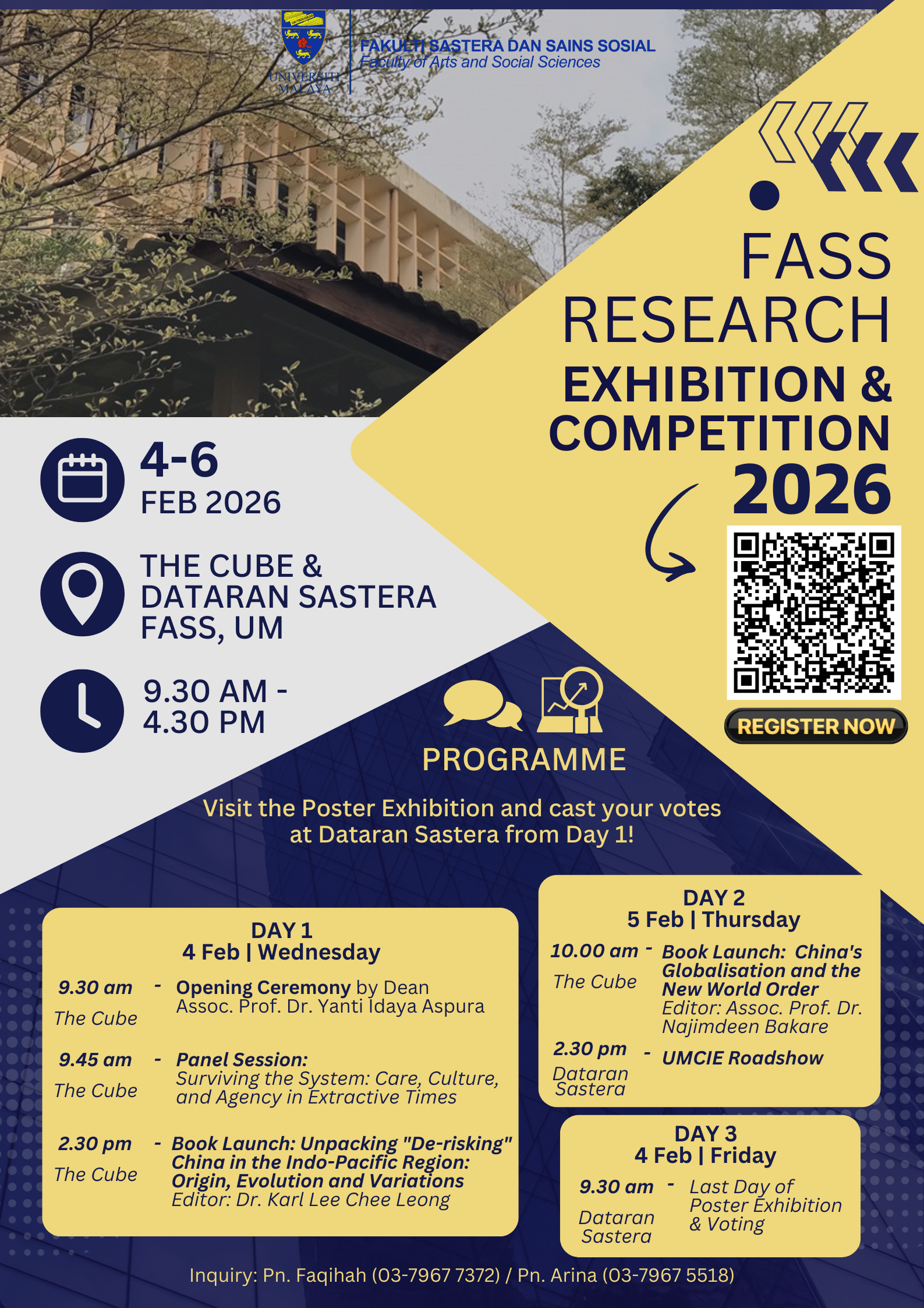 The Faculty of Arts and Social Sciences (FASS), Universiti Malaya is pleased to invite all academic staff, postgraduate and undergraduate students, as well as members of the UM community to the FASS Research Exhibition & Competition (FASS-REC) 2026, a three-day research showcase featuring exhibitions, book launches, panel discussions, and engagement activities.